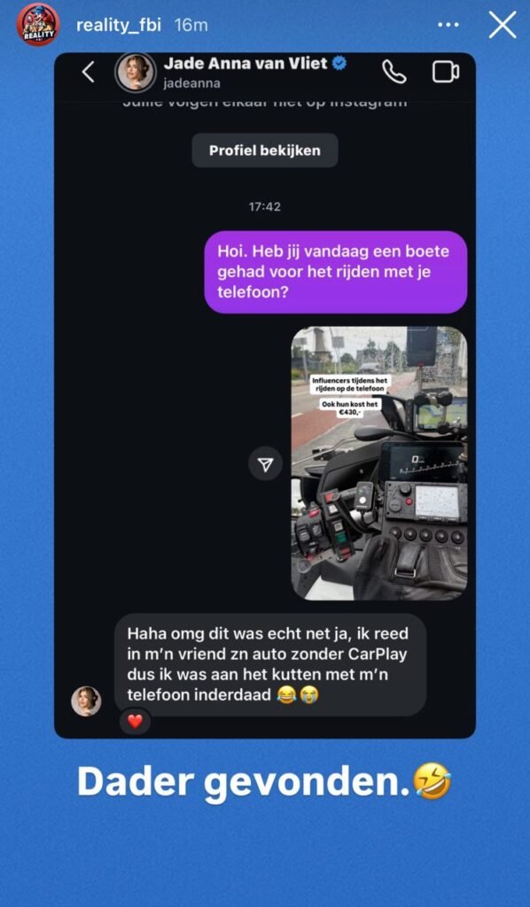 Lang hoeven volgers daar niet naar te raden, want even later deelt RealityFBI een privébericht van niemand minder dan Jade Anna zelf.