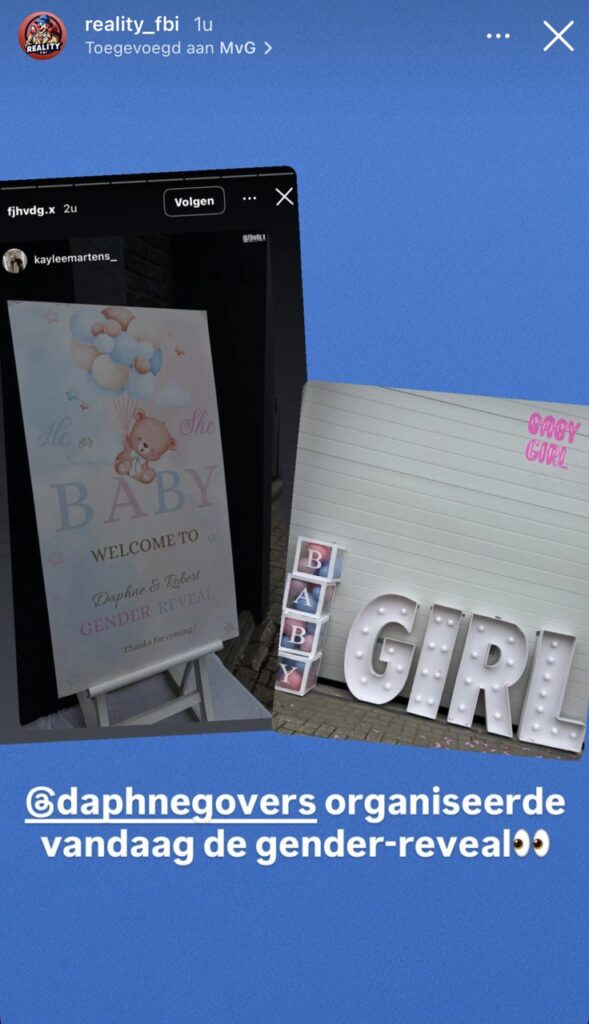 Daphne hield zaterdag een feest om het geslacht van haar baby te onthullen. Op het welkomstbord stond letterlijk: ‘Welcome to Daphne & Robert’s gender reveal.‘ De geruchten over het vreemdgaan van Daphne tijdens haar relatie met Van Gerwen zijn “dus waar”, zo stelt RealityFBI vast.