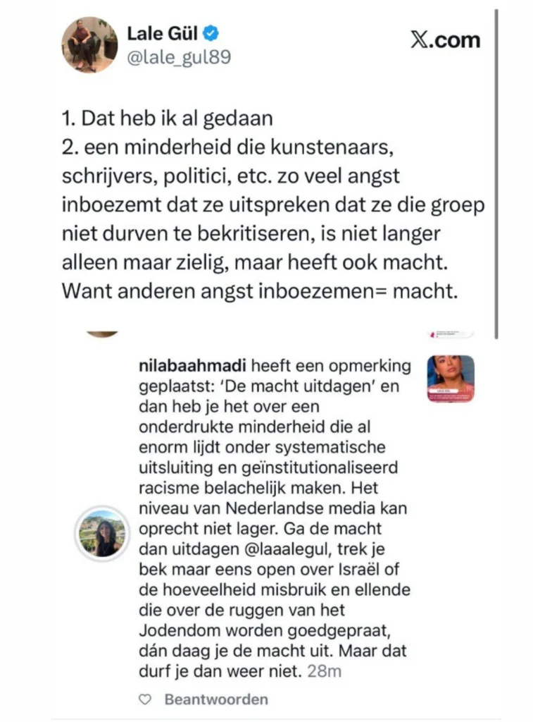 In een uitgebreide post op LinkedIn schrijft Gül dat Nilab Ahmadi haar in een reactie heeft toegesnauwd dat ze haar “bek” moet houden over de vrijheid van meningsuiting, en die “bek” juist wijd open moet trekken over Israël. Gül reageert verontwaardigd: “Dat zegt ze tegen mij, terwijl ik me al weken uitspreek tegen het beleid in Israël, zelfs heb opgeroepen tot sancties en een zeer tegengestelde positie heb ingenomen in mijn krant.”