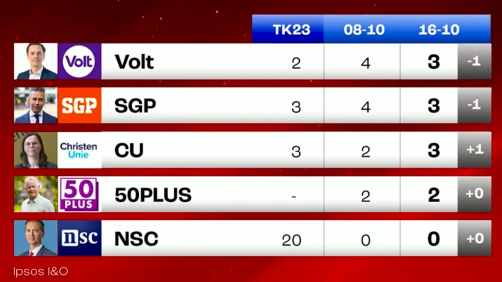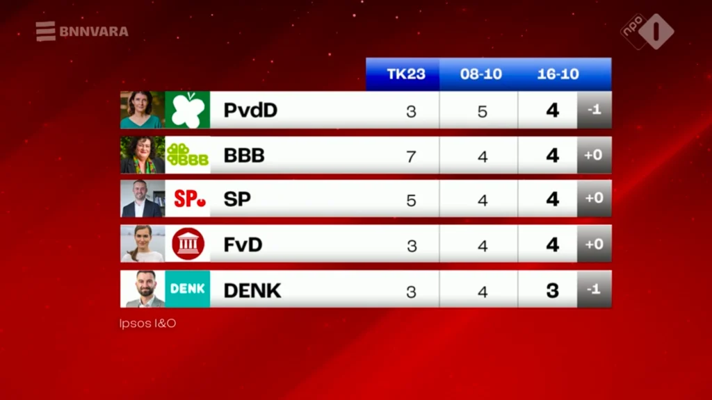 Peter Kanne van Ipsos licht toe: “We hebben beweging. Vorige week zei ik: helaas er gebeurt eigenlijk nog niks. Ik denk dat er nu wel wat aan het schuiven is. D66 gaat van 14 naar 18. Je kunt zeggen: hij is nog niet de eerste of tweede partij, maar er gebeurt wel degelijk wat. Want hij komt natuurlijk van 9 zetels (bij de Tweede Kamerverkiezingen van 2023, red.). Je ziet echt dat D66 een beweging naar boven maakt.”