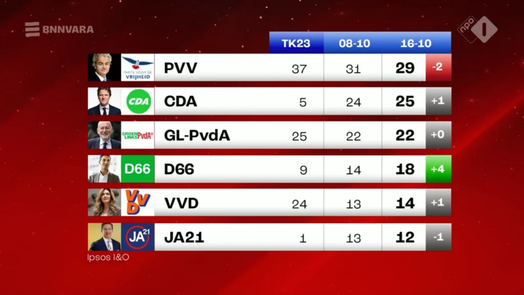 De PVV lijkt met nog twee weken te gaan tot de Tweede Kamerverkiezingen in te storten. In de nieuwste Ipsos I&O-zetelpeiling zakt de partij van Geert Wilders van 31 zetels naar 29 zetels, ten opzichte van de vorige peiling van 8 oktober. Dat zijn er liefst 8 minder dan bij de Tweede Kamerverkiezingen van 2023. Ondertussen komt Rob Jetten op stoom met D66, dat liefst 4 zetels stijgt ten opzichte van de vorige peiling van 8 oktober en nu virtueel op 18 zetels staat.