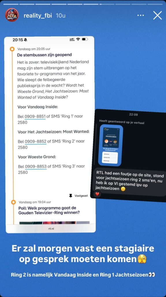 RTL paste het later aan op zijn website, maar de vraag rijst in hoeverre de fout het verloop van de uitslag heeft beïnvloed, vooral nu het verschil tussen Vandaag Inside en de concurrentie zo enorm was. “Er zal morgen vast een stagiaire op gesprek moeten komen”, schrijft RealityFBI.