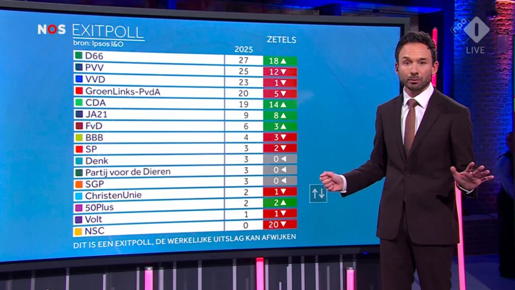 De PVV wordt bij de eerste exitpoll getaxeerd op 25 zetels. Dat zijn er liefst 12 minder dan bij de Tweede Kamerverkiezingen van 2023. Rob Jetten lijkt de grote winnaar van de verkiezingen te gaan worden: D66 is met 27 zetels vooralsnog de grootste partij.