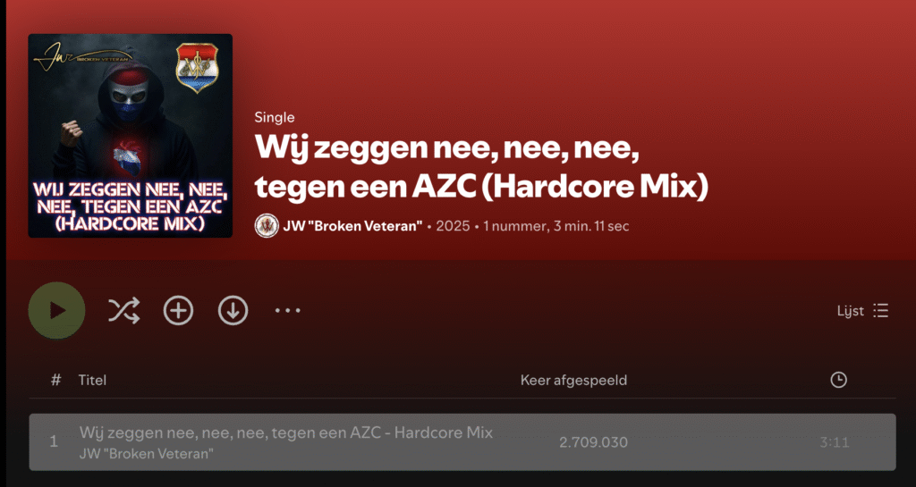 Het lied, dat hardcoremuziek combineert met een AI-gegenereerde stem, bevat teksten als: “Alle grenzen open, ons land is in nood. (…) Ze overspoelen ons met mensen die hier niet passen. Asielzoekers met fatbikes, iPhones, dure jassen.”