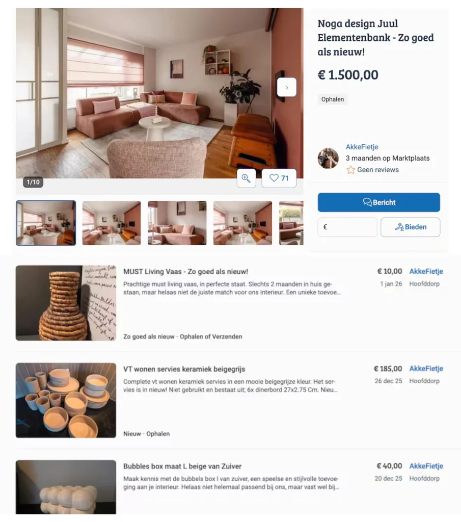 Opvallend detail is de gebruikersnaam waarmee Denise en René de spullen aanbieden. Op Marktplaats gebruiken ze de naam ‘Akkefietje’, een duidelijke verwijzing naar stylist Fietje en de inmiddels beruchte aflevering die maandenlang onderwerp van gesprek bleef.