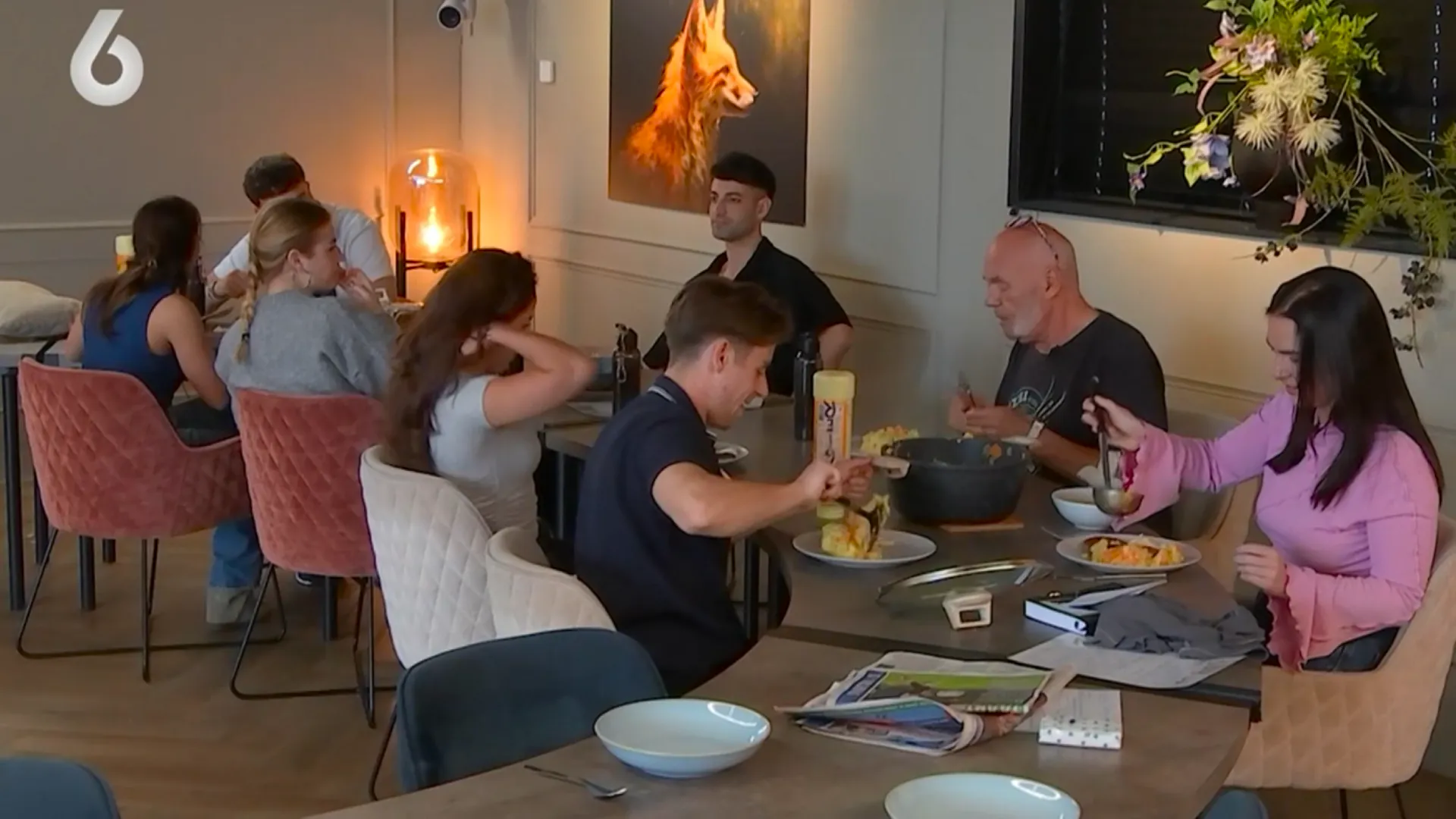 De felle reactie van Frank leidt tot gelach aan tafel, onder anderen van Roxy en Noah. “Al m’n liefde zit erin”, zegt Frank. “Je frustratie ook?”, vraagt Noah. Frank antwoordt: “Nee, die heb ik net hier op tafel gefl*kkerd.”